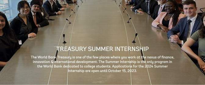 The World Bank Treasury is one of the few places where you work at the nexus of finance, innovation & international development. The Summer Internship is the only program in the World Bank dedicated to college students. Applications for the 2024 Summer Internship are open until October 15, 2023.